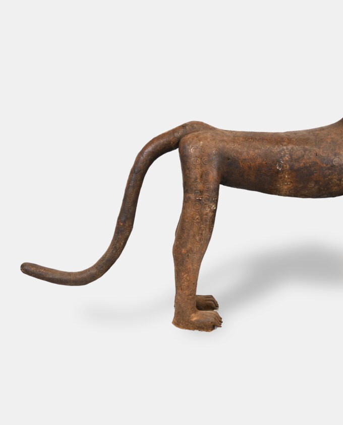 Cette sculpture représente un léopard, animal sacrés et symboles de royauté dans la culture béninoise. Ornés de motifs en spirale gravés sur tout le corps, ils incarnent la force, la vigilance et l’autorité du roi (Oba). Ses crocs saillants et sa posture droite renforce son rôle protecteur, souvent associé aux gardiens spirituels des palais royaux.