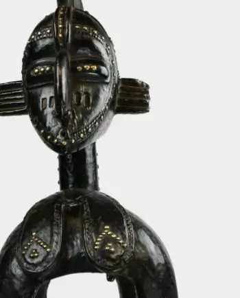 Ce masque anthropomorphe représente le visage d’une femme issue du peuple Baoulé. Dénommé « Ndoma », c’est-à-dire « double », « réplique » ou encore « équivalence » en Baoulé, ce superbe objet africain porte le nom d’une femme du village en hommage à laquelle un individu, voire même un groupe d’admirateurs, a commandé son effigie à un sculpteur. Sculptés dans un bois dense, les traits du visage de ces masques africains sont très fins et donnent une impression de sérénité. Le front haut symbolise l’intelligence et les yeux baissés le respect du monde environnant. Ce masque africain est très représentatif de l’art Baoulé avec ses formes et ses volumes équilibrés, les détails finement sculptés et tressés, notamment la coiffure, le nez rectiligne, la bouche ourlée et les scarifications spécifiques.